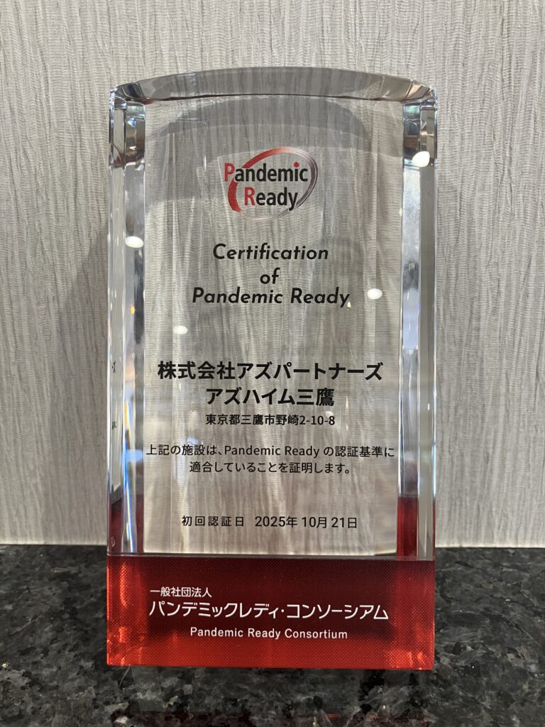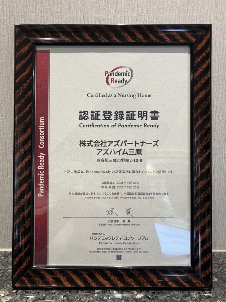 株式会社アズパートナーズ(本社:東京都千代田区、代表取締役社長 兼 CEO 植村健志)が運営する介護付き有料老人ホーム「アズハイム三鷹」は、2025年10月21日、感染症対策における新たな国際基準「パンデミックレディ施設認証」を日本で初めて取得しました。