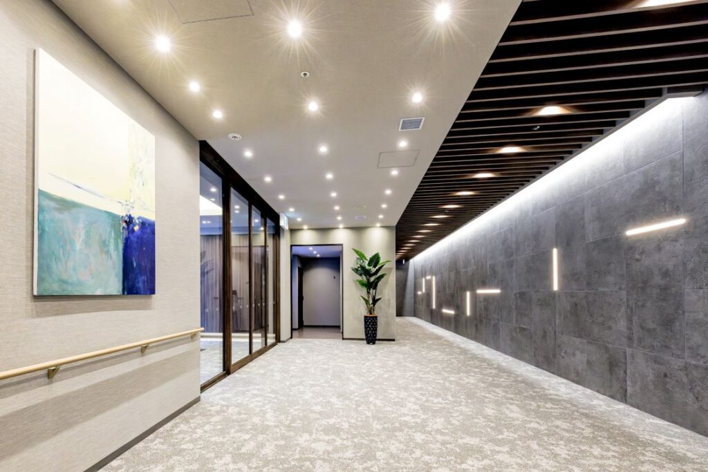 エントランスでは木調ルーバーの天井や石貼りの壁面が上質な雰囲気を演出し、ご入居者を落ち着いた空間でお迎えします。