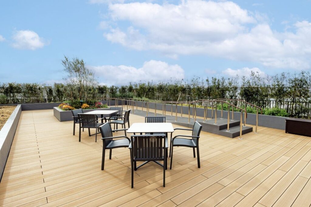 「アズハイム足立六町」は全95室(全室個室)が2階以上に配置されており、プライバシーへの配慮と安心感が確保されています。最上階には屋上庭園を設け、家庭菜園やガーデニングを楽しめる菜園スペースを設置しました。歩行訓練スペースの正面にはスカイツリーを望む景観が広がり、リハビリの時間にも街の広がりを感じていただけます。各階のダイニングはすべて南向きで、あたたかな日差しが差し込む心地よい空間です。テラスに出ると大きな空が広がり、隣接する小学校から聞こえる子どもたちの元気な声が毎日の暮らしに活気を与えてくれます。さらに、ダイニングを中心に左右へ居室がつながるレイアウトとすることで、共用部と居室間の移動がしやすく、生活動線に無理のない設計としています。