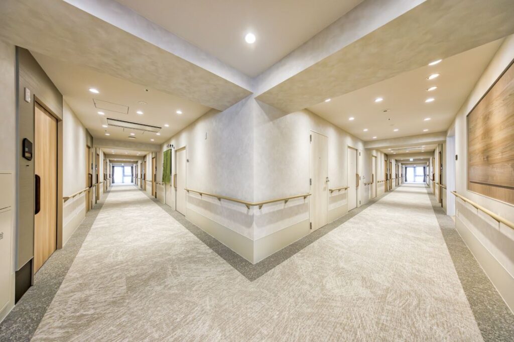 館内には、空の広がりや、街の見通しの良さを連想させるデザインをポイントで取り入れています。各居室の表札は六角形をモチーフにデザインし、相談室やロビー、各階の廊下には空の表情を思わせる絵画を配置、南向きの豊かな採光と、天空の広がりを表現した機能訓練スペース、白壁には雲をイメージした模様をあしらうなど、階ごとに異なる空の変化を感じられる設えとしています。