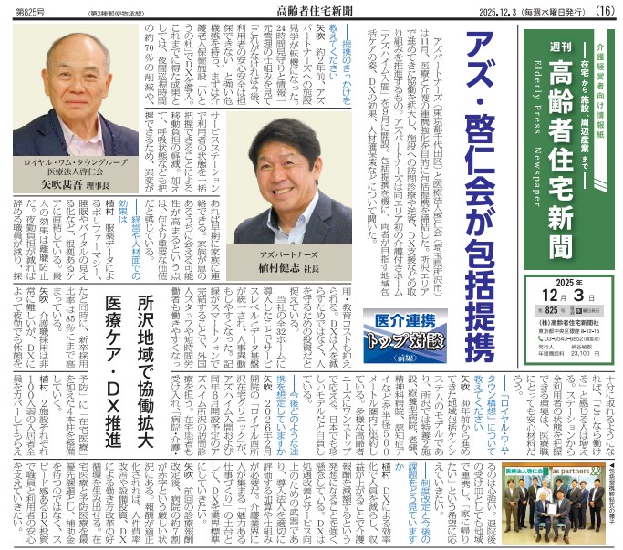 株式会社アズパートナーズは、医療法人啓仁会との医療・介護連携に関する包括提携に関連し、当社代表・植村と同法人理事長の対談内容が、高齢者住宅新聞(2025年12月3日号)に掲載されました。